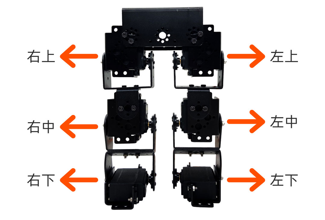 如图为搭建好的滑步机器人,一共用到了六个舵机,以上图为例,如下为接线方式:
