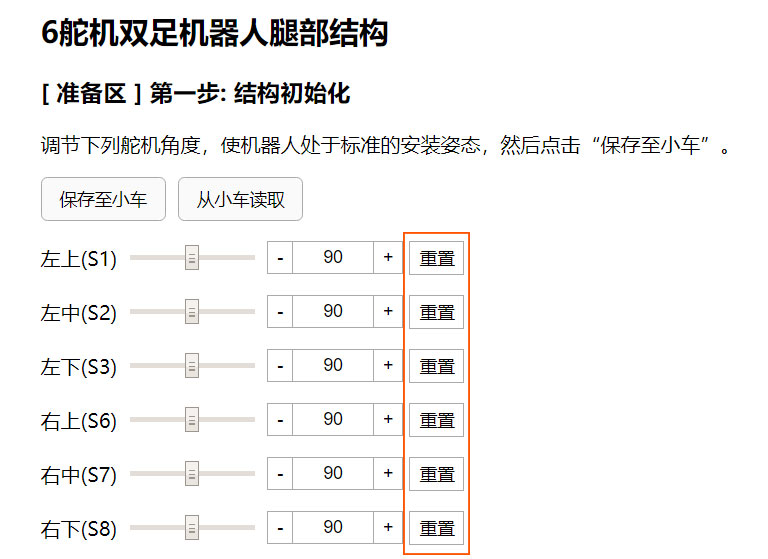 我们可以打开滑步机器人操控台,按照顺序依次将舵机接入主控板,依次点击重置,便可完成舵机复位。